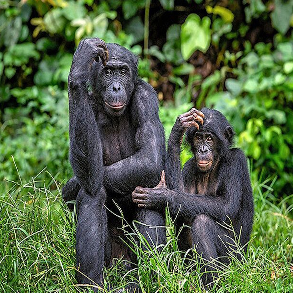 И поговорим про самого близкого, исходя из генетического кода, к нам ныне существующего вида. Это бонобо или карликовые шимпанзе. Карликовые шимпанзе – это не просто подвид более мелких шимпанзе, это отдельный вид, и, как говорят генетики, бонобо – самый близкий к нам, людям, вид из ныне живущих существ.