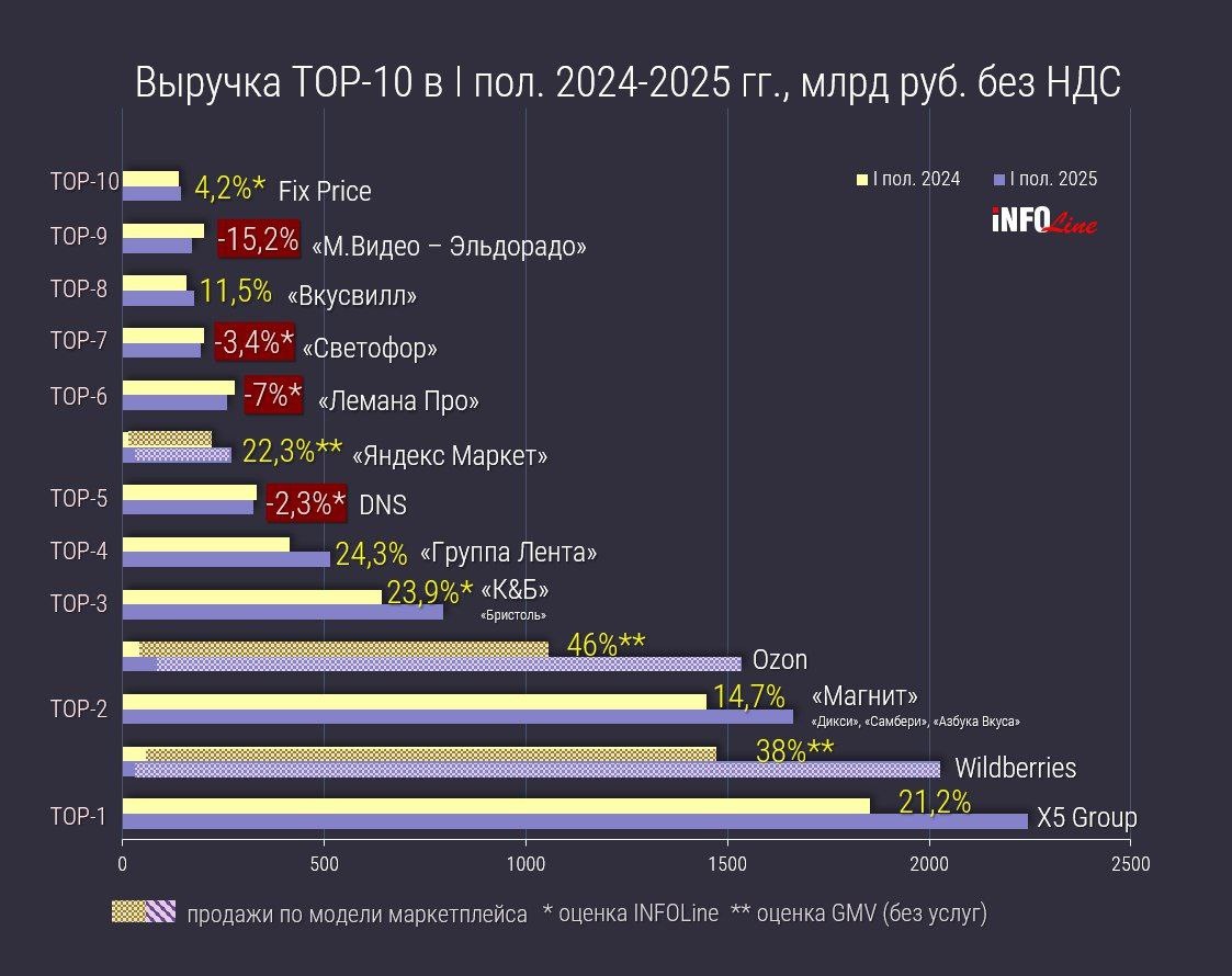 У большинства российских ретейлеров в I полугодии снизились продажи Замедлился рост продаж у десяти крупнейших торговых сетей, отмечают эксперты INFOLine. За первое полугодие выручка топ-10 игроков увеличилась на 14,1%, год назад рост составлял 22,2%. Михаил Бурмистров, генеральный директор INFOLine-аналитики, отмечает, что высокие темпы роста сохраняются преимущественно у маркетплейсов, тогда как у большинства ретейлеров продажи снижаются. Оборот крупнейших маркетплейсов в I полугодии вырос на 25,1% и достиг 4,25 трлн рублей. Эксперты полагают, что во втором полугодии тенденции сохранятся, в нонфуде продолжат лидировать Wildberries и Ozon, в продуктовом сегменте — федеральные сети. Индустрия