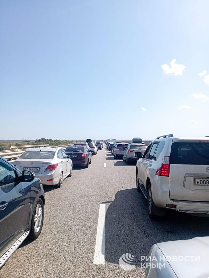 Крымский мост сейчас работает штатно, с обеих сторон сформировались очереди к пунктам досмотра.