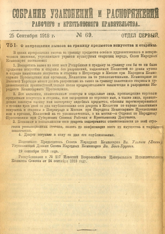 19 сентября 1918 года Совнарком принял декрет «О запрещении вывоза за границу предметов искусства и старины». Документ, подписанный В.И. Ульяновым (Лениным) и управделами В.Д. Бонч-Бруевичем, запрещал вывоз предметов искусства и старины с любой территории республики без предварительного разрешения музейных органов Наркомата просвещения.