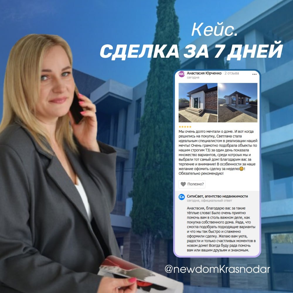 Сделка за 7 дней Ко мне обратилась семья, которая давно мечтала о собственном доме. У них были чёткие требования к объекту, и нужно было найти подходящий вариант быстро. За один день я подобрала и показала несколько домов, отвечающих их запросу. Среди предложений клиенты сразу увидели свой будущий дом. Мы оперативно оформили документы, и уже через неделю семья получила ключи. ✔️ Результат: клиенты счастливы, процесс прошёл спокойно и в комфортном для них темпе. Когда знаешь рынок и понимаешь запрос клиента, ключи от дома можно получить всего за 7 дней 😉 ✨ Напоминаю, консультация у меня бесплатная и я на связи 24/7 ________ Светлана Шаповал 📞 +7-918-45-245-95 #светланашаповал #домакраснодар #участкикраснодар #новостройкикраснодар #квартирыкраснодар #кейс #отзывыклиентов