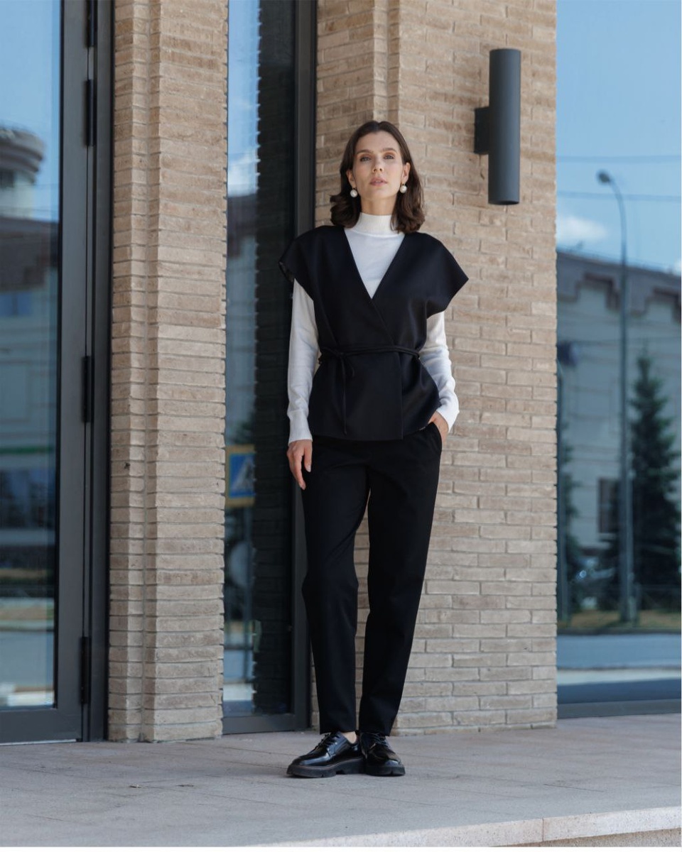 Игра цветов в коллекции "Шередан" - от мягкого экрю до глубокого черного. Это сочетание придает образам особую глубину и объем, позволяя вам выразить себя – будь то в лаконичном шике или в эффектных решениях. Обратите особое внимание на трикотажный жилет с брюками и изящную расклешенную трикотажную юбку, которые станут основой ваших новых любимых образов.