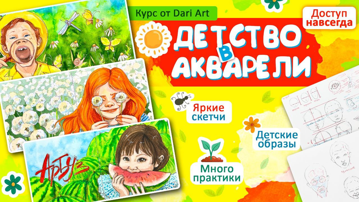 Особенности курса "Детство в акварели": 🧩 Новая структура курса: уроки по теории чередуются с практикой Изучаем тему, создавая зарисовки (например, особенности пропорций детского лица), а в следующем уроке закрепляем знания с помощью яркого скетча 🧩 Портрет и фигура в формате скетчей В курсе мы не стремимся к портретной точности и передаче сходства. Наша задача - уловить детские черты и пластику, подчеркнуть их, сделать ярче! Поэтому уроки курса подходят