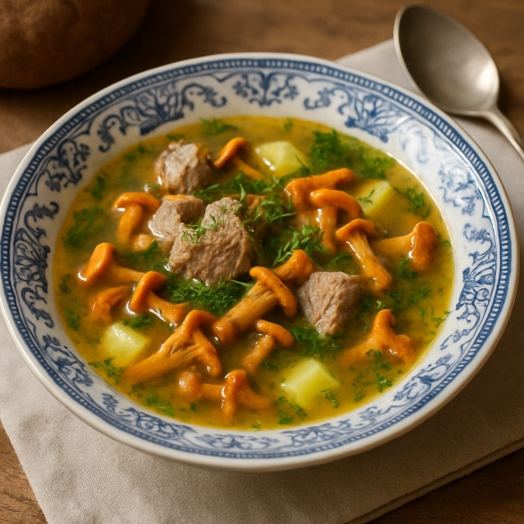 Суп с лисичками и мясом Ингредиенты ⤵️ 🔸 Лисички свежие – 300 г 🔸 Мясо – 300 г 🔸 Картофель – 3 шт. 🔸 Морковь – 1 шт. 🔸 Лук репчатый – 1 шт. 🔸 Чеснок – 2 зубчика 🔸 Бульон мясной – 1,5 л 🔸 Сливки 10% – 100 мл 🔸 Растительное масло – 3 ст. л. 🔸 Лавровый лист – 1 шт. 🔸 Соль, перец - 1 щепотка 🔸 Укроп - 1 пучок Приготовление🍄🟫 1. Мясо нарезать кубиками, отварить до готовности в бульоне. 2. Лисички очистить, промыть. Лук и чеснок измельчить, морковь натереть, картофель нарезать кубиками. 3. В кастрюле разогреть масло, обжарить лук до прозрачности. Добавить морковь, готовить 5 минут. 4. Добавить лисички, жарить до испарения жидкости. Добавить чеснок, готовить 1 минуту. 5. В бульон с мясом добавить картофель, варить 10 минут. 6. Добавить поджарку с грибами, лавровый лист, соль и перец. Варить 15 минут. 7. Влить сливки, прогреть 3-4 минуты. Подавать с зеленью. Рецепт дня #суп #грибной_суп #мясной_суп #грибы #мясо #свинина #говядина #обед