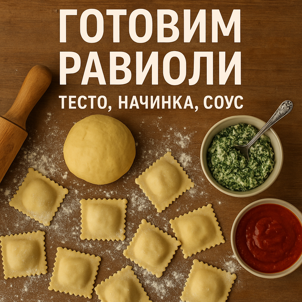 Готовим равиоли: тесто, начинка, соус –––––––––––––––––––––––––––––––––––––––––––––––––––––––––––––––––––––––––––––––– Равиоли – один из самых уютных и домашних видов итальянской пасты. Следуя нашим рекомендациям, вы научитесь делать идеальное тесто, вкусную начинку и соус, который подчеркнёт все нежные нотки этого блюда. Почему домашние равиоли лучше - Тесто на яйцах получается эластичным и нежным, не рвётся и хорошо держит форму. - Любая начинка – мясная, сырная или овощная – будет «как у повара» благодаря простым советам по подготовке. - Соус можно подобрать под любой вкус: сливочный, томатный или на основе зелени. *** 1. Тесто для равиоли Ингредиенты (на 4 порции) - Мука высшего сорта (тёмная или белая) – 300 г - Яйца куриные – 3 шт. - Соль – щепотка - Натуральное оливковое масло – 1 ст. л. (по желанию) Приготовление 1. Выложите муку горкой на чистый стол, в центре сделайте углубление. 2. Вбейте внутрь яйца, добавьте соль и масло. 3. Сначала вилкой — аккуратно смешивайте яйцо с