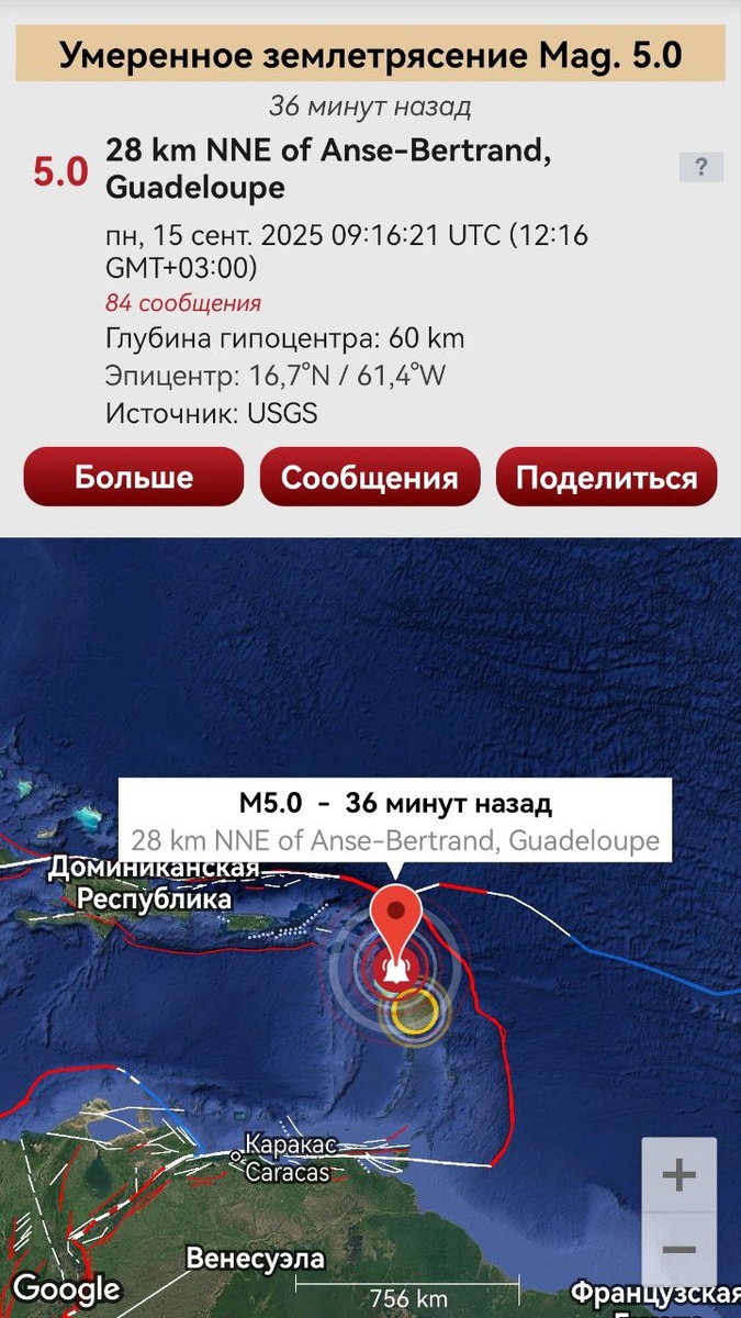 В ответ на пост Согласно предупреждению от 9 сентября произошло умеренное ощутимое землетрясение на восточной границе Карибской плиты. С 12 сентября по зоне наблюдаются регулярные ОСТИ уровня М6+ (фото 3-7). В течение 9 дней возможно продолжение сейсмики по данной зоне, вплоть до М6+ ====== According to the warning issued on September 9, a moderate noticeable earthquake occurred on the eastern border of the Caribbean plate. Since September 12, the zone has been experiencing regular CSTIs of the M6+ level (photos 3-7). Seismic activity in this zone may continue for 9 days, up to M6+.