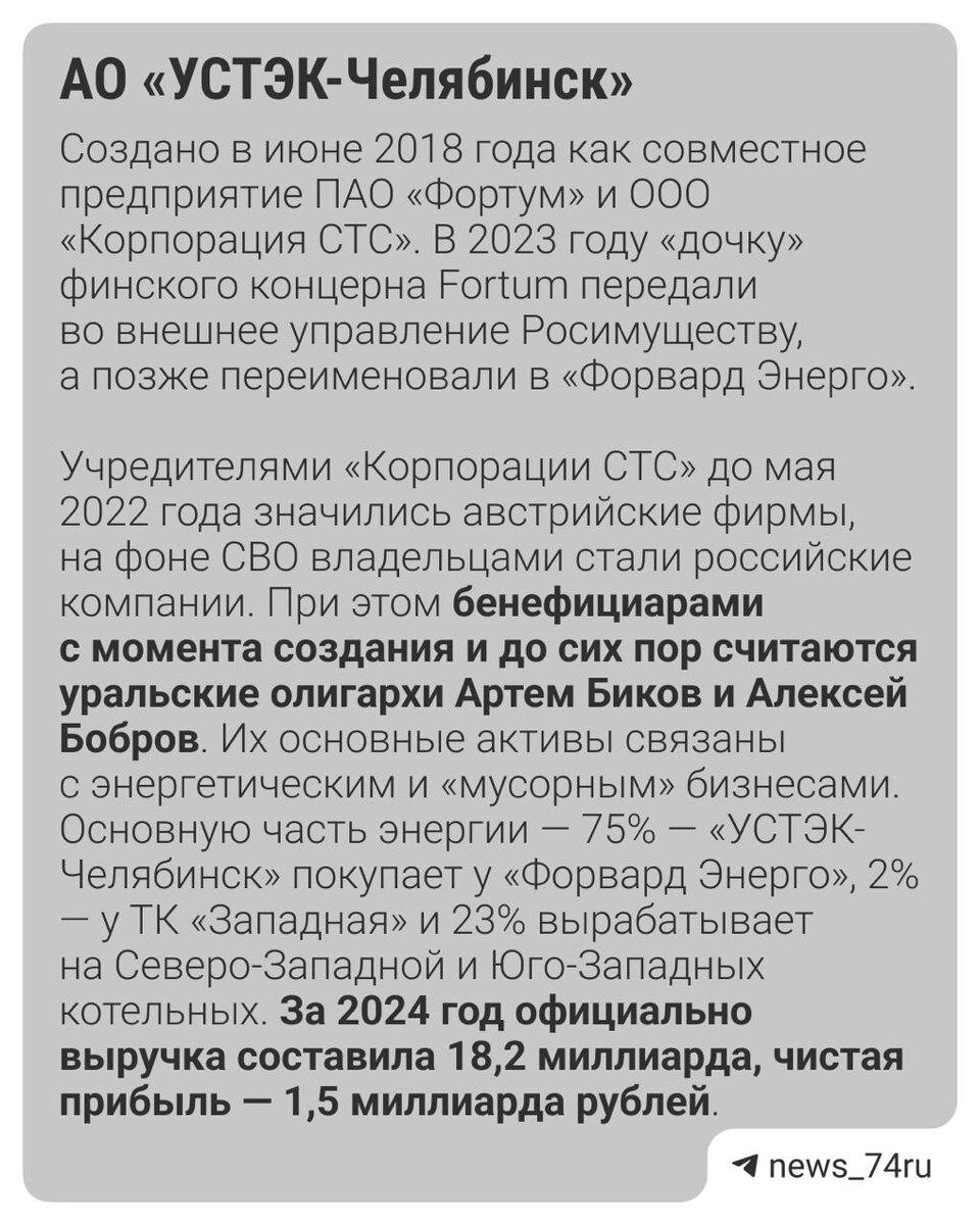 В ответ на пост ❗️ Подробности об иске о национализации активов олигархов, владеющих теплосетями Челябинска Артем Биков и Алексей Бобров также известны как хозяева информационного агентства URA.RU. В Генпрокуратуре считают, что члены федерального правительства, власти Свердловской области и представители бизнеса нарушили антикоррупционное законодательство. 🟥 Иск. По данным собеседников издания РБК, в иске Генпрокуратуры говорится, что получение Биковым и Бобровым объектов энергетической инфраструктуры Уральского региона стало возможным «ввиду наличия у них неформальных связей с руководителями федеральных и региональных госструктур», в том числе с бывшим председателем правления РАО «ЕЭС» Анатолием Чубайсом. Биков с мая 2003 года по июнь 2005 года был советником Чубайса. РБК, ссылаясь на источник в Генпрокуратуре, сообщает, что эти связи дали бизнесменам возможность «оказывать неограниченное влияние на административно-хозяйственные процессы и организационно-распорядительные решения