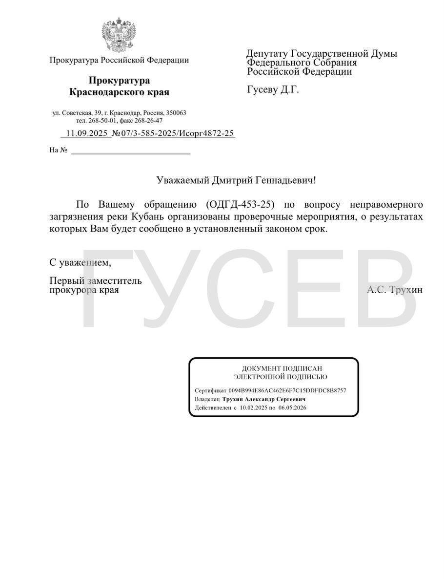 ⚖️ Наш запрос не остался без ответа — прокуратура Краснодарского края подключилась к ситуации. 🏞 Теперь факты сброса канализационных стоков в Кубань будут тщательно проверены.