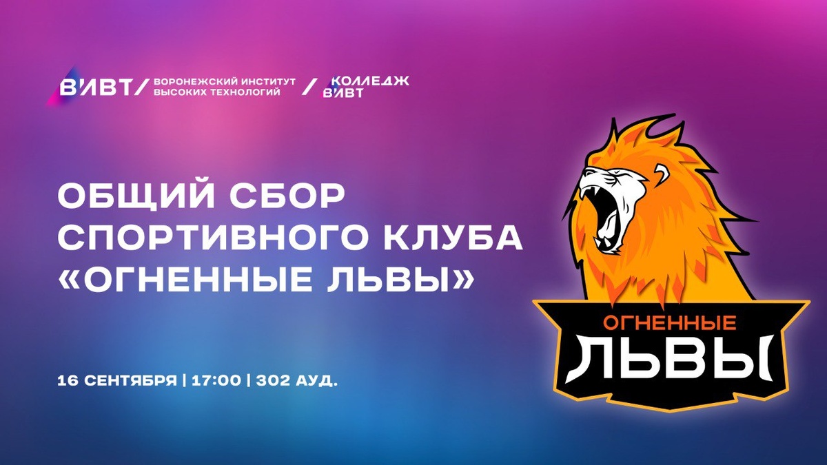 🔥 Внимание, спортсмены! Объявляется общий сбор спортивного клуба «Огненные львы»! Дата: 16 сентября Время: 17:00 Место: аудитория 302 Приглашаем: Спортсменов; Участников сборных команд холдинга; Всех желающих присоединиться к нам. Не упустите возможность встретиться с единомышленниками, обсудить планы и поделиться опытом! Ждём вас на нашем мероприятии.