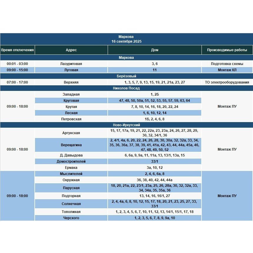 16 сентября будет частично ограничено электроснабжение в Иркутске, Иркутском и Шелеховском районе, а также в некоторых домах населенных пунктов, расположенных по Байкальскому, Голоустненскому и Плишкинскому трактам. Электроэнергиии не будет в связи с проведением плановых работ на сетях, пишет ИА IrkutskMedia со ссылкой на тг-канал (18+) "СВЕТ38". Адреса отключений. Фото: Тг-канал (18+) "Свет38" Адреса отключений. Фото: Тг-канал (18+) "Свет38" Адреса отключений. Фото: Тг-канал (18+) "Свет38" Адреса отключений. Фото: Тг-канал (18+) "Свет38" Адреса отключений. Фото: Тг-канал (18+) "Свет38" Адреса отключений. Фото: Тг-канал (18+) "Свет38" Адреса отключений. Фото: Тг-канал (18+) "Свет38" Адреса отключений. Фото: Тг-канал (18+) "Свет38" Адреса отключений. Фото: Тг-канал (18+) "Свет38" Адреса отключений. Фото: Тг-канал (18+) "Свет38" Адреса отключений. Фото: Тг-канал (18+) "Свет38" Адреса отключений. Фото: Тг-канал (18+) "Свет38" Адреса отключений. Фото: Тг-канал (18+) "Свет38" Адреса отключе