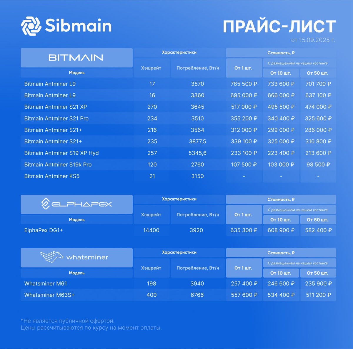 💲Актуальный прайс-лист на 15.09. Sibmain комплексные решения для майнинга под ключ! - Поставки майнинг оборудования - Дата-центр в Красноярске 80 МВт - Размещение от 5,4 руб/кВтч ⌨️ Нужна консультация или помощь в подборе оборудования? Звоните: +7(937)544-44-43 📍 г. Москва Калужская площадь д.1 к.1 💬 WhatsApp 💬 @Sibmain_salesbot 🌐 sibmain.ru