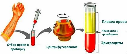 - Разделение крови на фракции. Кровь помещают в центрифугу, где она разделяется на плазму и тромбоциты.