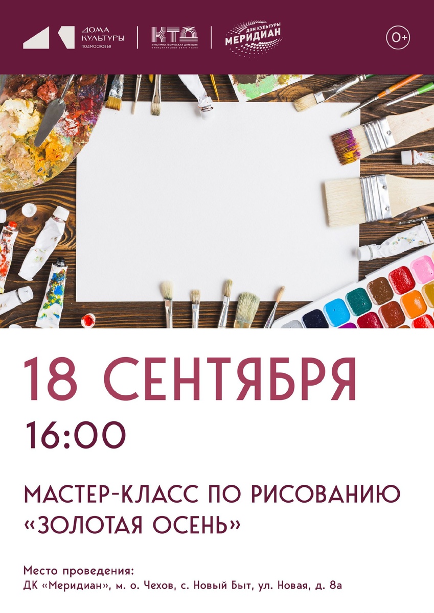 ✨ Мастер - класс по изобразительному искусству 🎨Будем рисовать яркую разноцветную осень 🚫 Возраст: 6+ 📆 18.09.2025 🕛 16:00 🏢 ДК «Меридиан» 📍 г.о. Чехов, с. Новый Быт, ул. Новая, д.8а 🪙 Вход свободный❗️ ⭐Поддержать канал голосом ✅ Мероприятия Чехов https://dzen.ru/id/66cc4b48e9ef144699238a51 http://vk.com/chekhov_events http://dzen.ru/chekhov_events