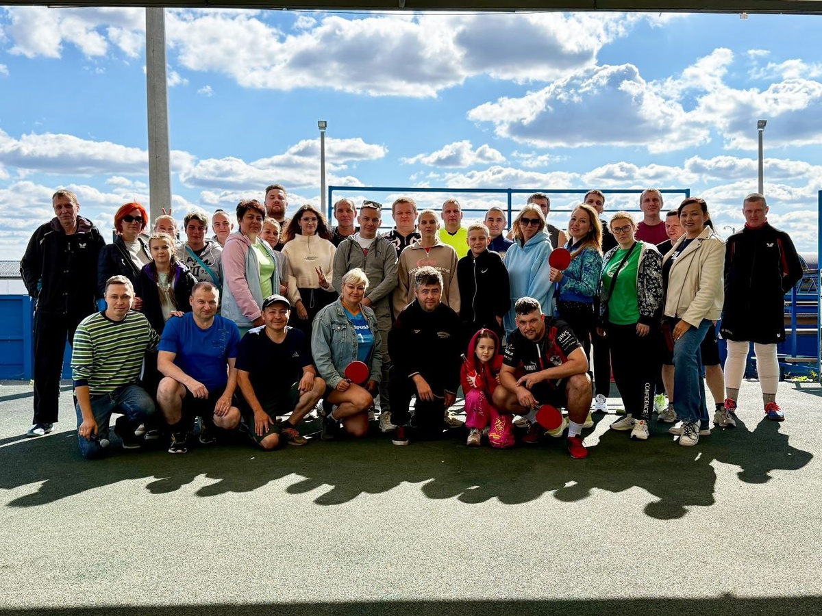 Общая фотография на турнире по настольному теннису в посёлке "Соты" среди любителей и профессионалов.