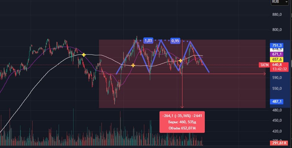 #TATN #Татнефть 🕯 Похоже построил тройную вершину. Фигура пока что не подтверждена. 🔽Подтверждение фигуры будет пробитие 616 и закрепление ниже этого уровня. 📉Отработка фигуры примерно до 490. Пока что сигналов в Лонг нет. ✔️Третья вершина похоже на голова плечи, что ещё раз подтверждает нам продолжение падения. НЕ ИИР