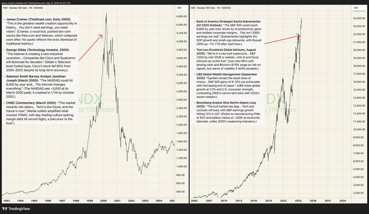 «Это не пузырь, это новая эра» — знакомо звучит? В 2000-м Джим Крамер убеждал, что «вам не нужны прибыли, вам нужно видение». George Gilder обещал, что интернет «навсегда изменит мир». NASDAQ тогда рвался к 6000 — а через два года рухнул до 1100. Сегодня мы слышим то же самое — только вместо «интернета» у нас AI и продуктивность. Bank of America ждёт S&P 500 на 6800 уже к концу года. Tom Lee говорит о «суперцикле». UBS считает, что 8–12% в год — легко. Bloomberg уверяет, что «рынок ещё имеет ноги». Забавно, как риторика повторяется. В конце 90-х FOMO подогревали сайты-пустышки вроде Pets.com, сегодня — истории про AI-прорывы и «ракеты» в крипте. Тогда CNBC писал: «этот рынок вознаграждает риск». Сегодня: «суперцикл, это не 2000-й». К чему это приведёт? История показывает: на пиках всегда находят новые оправдания. «Это не пузырь, это фундаментально другое время» — фраза вечная. Возможно, так и есть. Но инвестору важно помнить: боли 2001–2002 пришли не из-за того, что интернет был фе