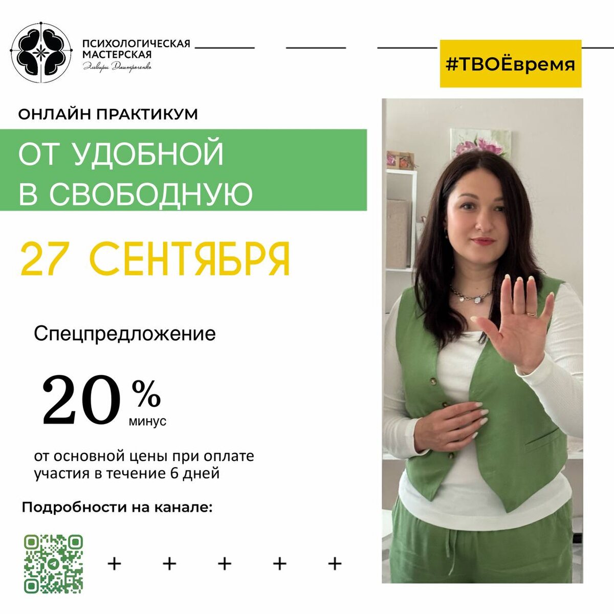 Начинаем 27 сентября! Успей забрать скидку до 20го! 🔥 Говорите себе «в понедельник начну новую жизнь», но снова откладываете? Мечтаете о переменах, но не знаете, с чего начать? Чувствуете, что живете на автопилоте, а внутри — выгорание, тревога и тихий голос: «А где же я?». Знакомо? Тогда вам — сюда! ⭐️Я открываю запись на свой новый практический интенсив — «ОТ УДОБНОЙ В СВОБОДНУЮ». Старт — 27 сентября. Это не «еще один курс», а 4 недели глубокой практической работы над вашим внутренним стержнем. Мы будем не просто говорить, а делать упражнения, менять привычные схемы и закреплять новые навыки. ⭐️Что ждет внутри? Всего за месяц мы проработаем 4 ключевые опоры вашей устойчивости: ⏹️САМОЦЕННОСТЬ — учимся слышать себя, а не внутреннего критика. ⏹️ГРАНИЦЫ — говорим «нет» тому, что истощает, и «да» — тому, что наполняет. ⏹️УСТОЙЧИВОСТЬ — остаемся в ресурсе, даже когда вокруг шторм. ⏹️МЕЧТЫ — возвращаем себе смелость хотеть большего и знаем,как этого достичь. ⭐️Формат — максимально п