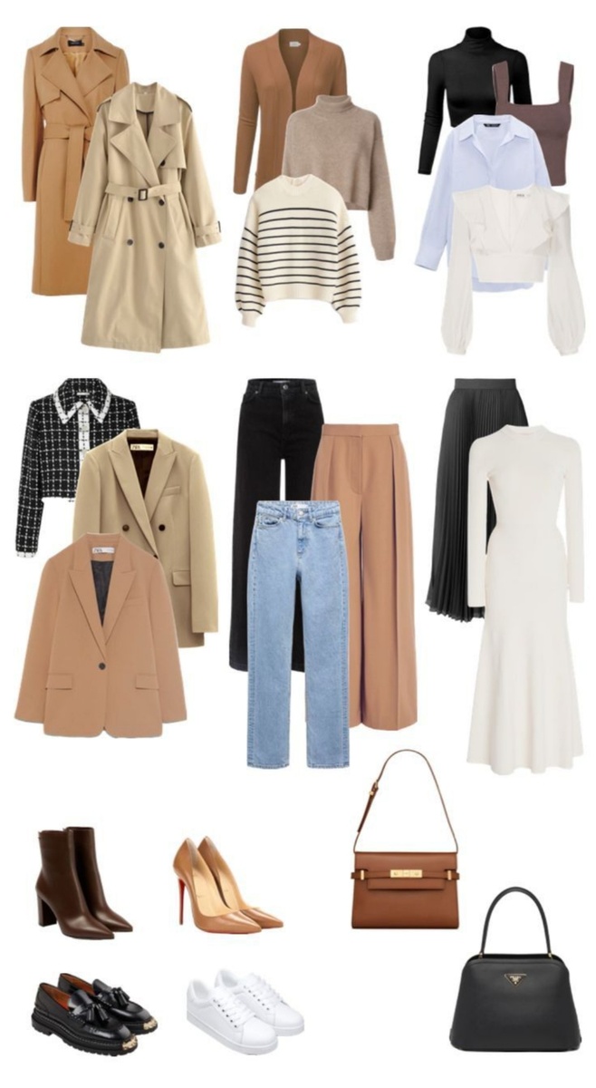 Основу капсулы составляют базовые вещи нейтральных цветов. К ним добавляется несколько акцентных предметов и аксессуаров для разнообразия.