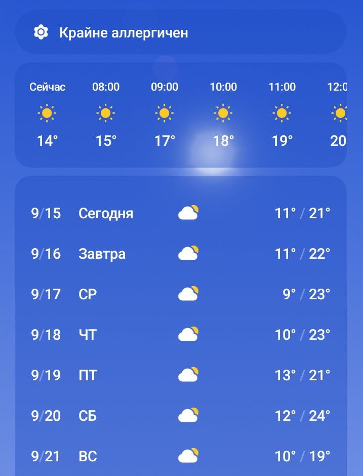 🧣Погода на неделю: комфортная осень 🍁 Температура воздуха +21 +23 градуса, к субботе чуть теплее - +24, а в воскресенье похолодает до +19. Будут актуальны джинсовки. ⛅️Осадков не ожидается. 🌼Немного омрачит все лишь концентрация пыльцы в воздухе, расслабиться у аллергиков не получится.