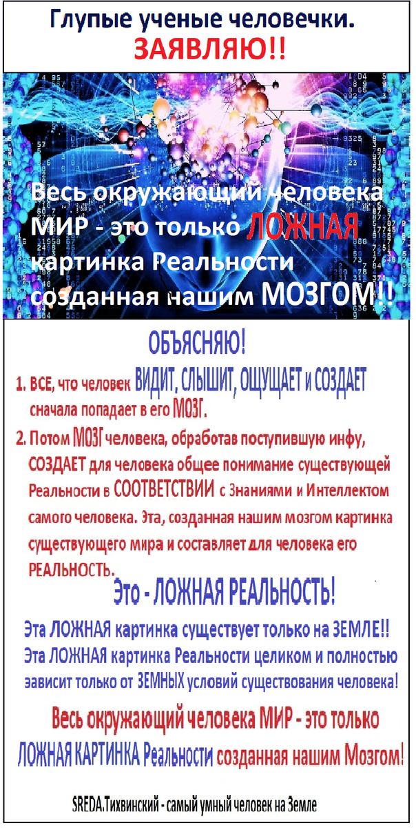 ВСЕ существующие на сегодня человеческие Знания и Законы о существующем мире, ВСЕ наши физические науки о Вселенной, Материи и Атомах - это ОГРОМНАЯ НАУЧНАЯ ГЛУПОСТЬ и ОБМАН человечества, созданный т.н. «учеными» только лишь для того, чтобы получать свои ЗВАНИЯ, ГРАНТЫ и ПРИВИЛЕГИИ!!
