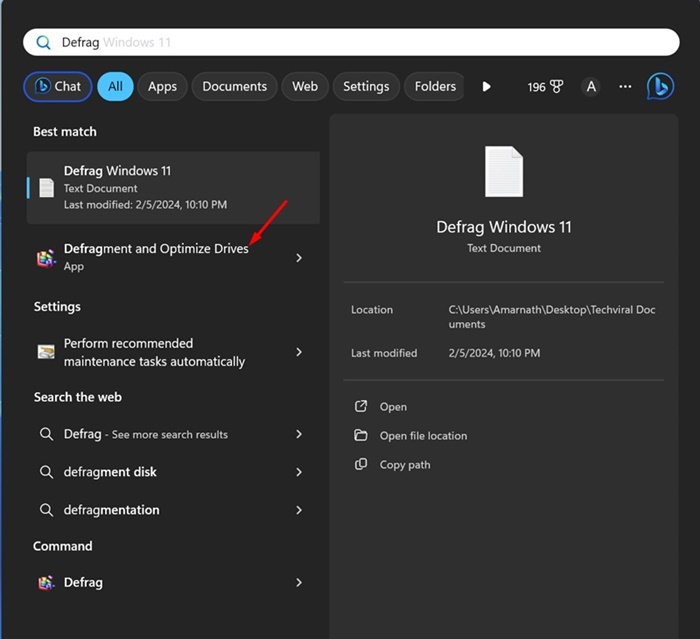 1. Введите «Дефрагментация» в поиске Windows 11. Откройте « Дефрагментация и оптимизация дисков» из списка наиболее подходящих результатов.