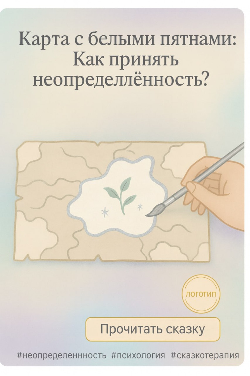 🧚♂️ Терапевтическая сказка: «Карта с белыми пятнами» В далёкой долине Жила-была Девочка, которая очень любила знать всё наперёд. У неё была огромная Карта Мира, подробная и точная. Все тропинки были прорисованы, все реки подписаны, все горы отмечены точной высотой. Девочка сверялась с Картой каждое утро и всегда знала, куда сделать следующий шаг. Это придавало ей уверенности, и жизнь была ясной и предсказуемой. Но однажды утром она обнаружила, что на самом краю Карты появилось первое Белое Пятно. Оно было чистым, пустым и молчало. Девочка испугалась. Она попыталась закрасить его, дорисовать знакомые деревья и речушки по памяти, но краска скатывалась, а карандаш ломался. Белое Пятно оставалось нетронутым. Вскоре таких пятен стало больше. Они появлялись в самых неожиданных местах Карты, скрывая привычные маршруты. Девочка чувствовала растерянность и досаду. Она сидела и смотрела на пропасти неизвестности, и её сердце сжималось от страха. Как-то раз, не зная, куда идти, она просто се