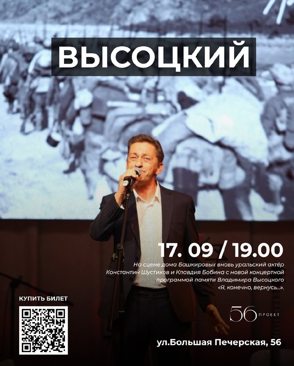 🎙 Высоцкий. Я, конечно, вернусь… 📅 17 сентября в 19:00 📍 Проект 56 / Дом Башкировых Поэт и Время — величины, не существующие друг без друга. Высоцкий стал. И не только Поэтом. На сцене — уральский актёр Константин Шустиков и Клавдия Бобина с новой программой памяти Владимира Высоцкого. Это вечер настоящей энергии и живого слова: 🎵 лирика и песни о войне 🎭 жанровые композиции 📻 ностальгия 70-х 🕰 и острота сегодняшнего дня Пространство, где прошлое и настоящее встречаются в голосе одного человека. Высоцкий возвращается — в стихах, песнях и памяти. 😄 Мероприятия Нижний Новгород. Я местный!