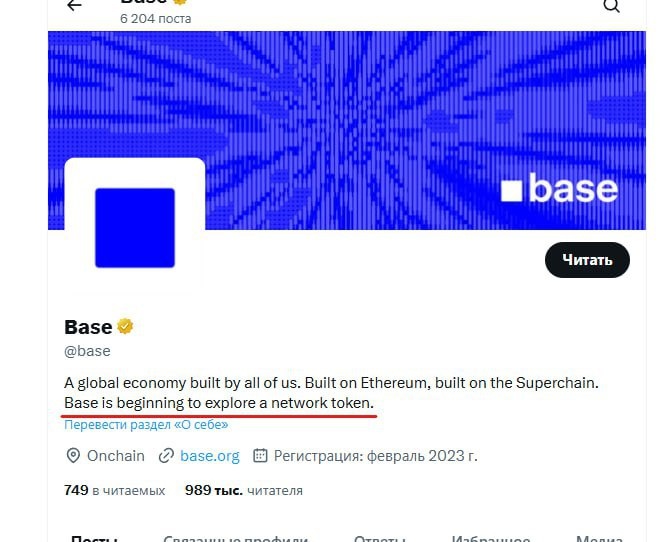💰 Вот это мощный прогрев к токену. В описание канала Base добавили: "Base начинает изучать возможность запуска сетевого токена".