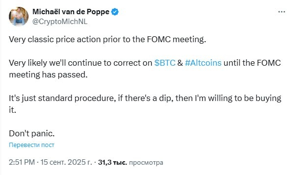 Очень классическое ценовое движение перед заседанием ФРС. С большой долей вероятности мы продолжим коррекцию на BTC и альткоинах, пока не пройдет заседание ФРС. Это стандартная практика: если будет откат, я готов на нём купить. Без паники.