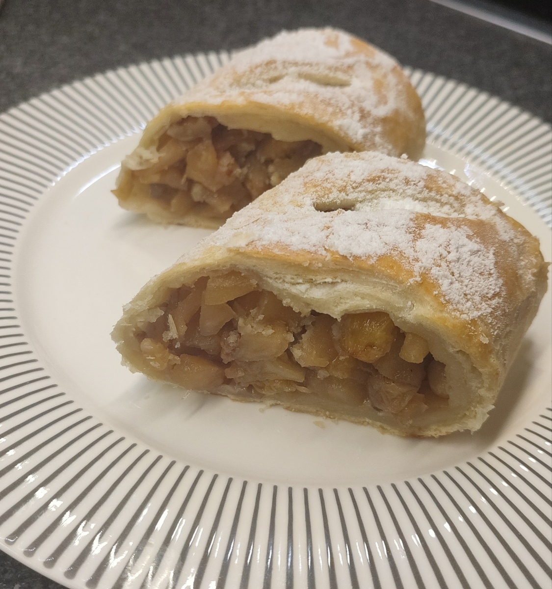 Это самый быстрый штрудель из замороженного слоёного теста, которое у меня всегда в морозилке. Когда гости на пороге, из этого теста можно приготовить разные десерты. У меня в ленте несколько вариантов десертов из слоёного теста.