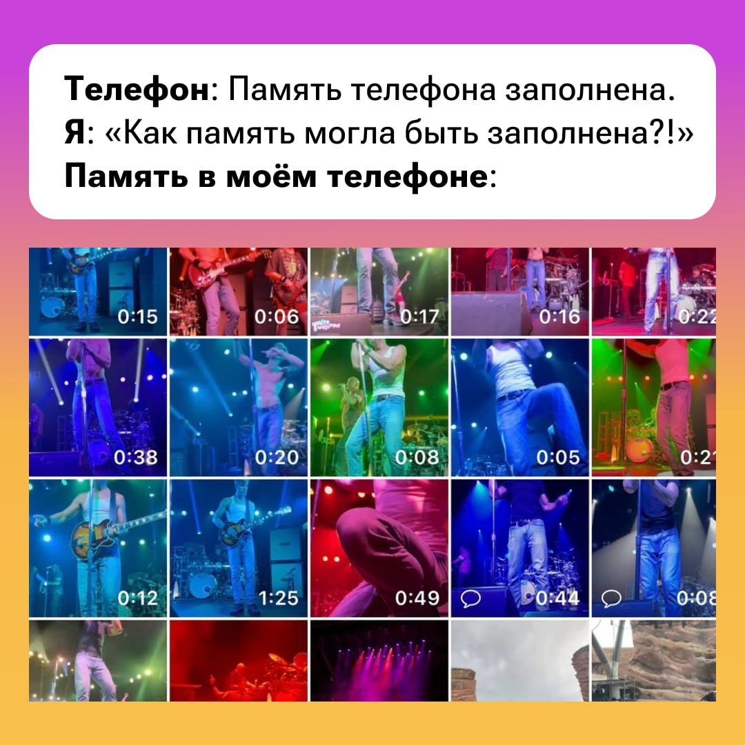 🦄 — вообще не снимаю. Считаю, что на концерте нужно смотреть на сцену, а не на экран смартфона.