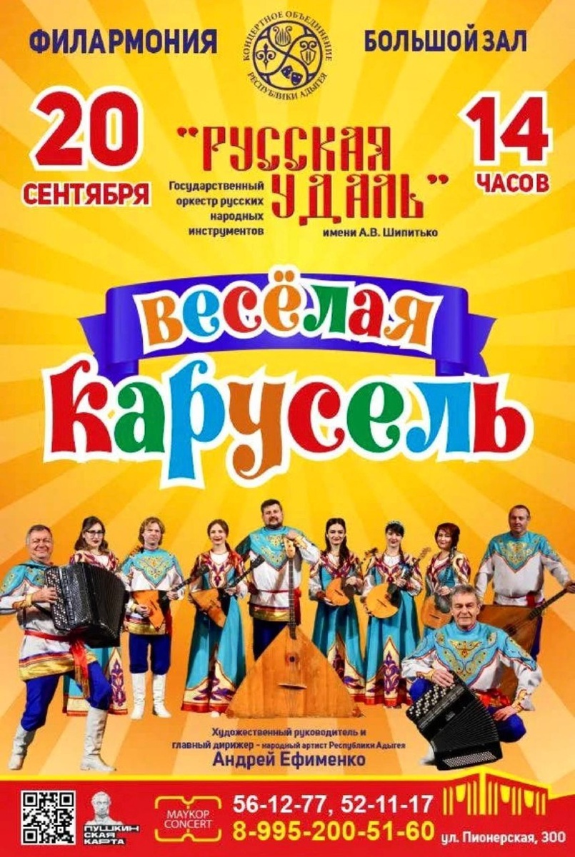 20 сентября в 14:00 в Филармонии КОРА состоится семейная концертная программа «Весёлая карусель», которую представит Государственный оркестр русских народных инструментов «Русская удаль» им. А.В. Шипитько Зрителей ждёт насыщенная программа: музыкальные сюрпризы, тематические игры и викторины, творческие подарки для юных гостей и их родителей. ▫️ Художественный руководитель и главный дирижёр — народный артист Республики Адыгея Андрей Ефименко ▫️ Дирижёр — Николай Кустов ▫️ Ведущая концерта — Ирина Ибрагимова 🟥Мероприятие входит в программу «Пушкинская карта» #новости_минкульт_РА #КОРА #РеспубликаАдыгея #Победа80