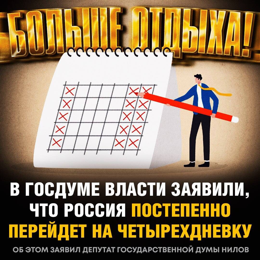 ❗️ В России введут ЧЕТЫРЕХДНЕВКУ — новый график работы с сохранением зарплат пообещали сделать в Госдуме Режим четырехдневной рабочей недели будет вводиться постепенно. Сразу и для всех рабочих сфер — рискованно. Часть компаний в РФ уже работают по новому графику Основные плюсы четырехдневной рабочей недели: — Повышение продуктивности: сокращение кол-ва рабочих дней, соответственный буст сосредоточенности и эффективности. Меньше «лишнего времени» и прокрастинации, так как задачи нужно уложить в сжатый срок; — Улучшение баланса между работой и личной жизнью: больше отдыха с семьей, больше времени на хобби или другие обучения. Также снижается риск выгорания и хронической усталости; — Здоровье: меньше стресса — больше сна и свободного времени. Снижение уровня проф. заболеваний (переутомление и сидячий образ жизни); — Привлечение и удержание сотрудников: компании с более короткой рабочей неделей становятся привлекательнее на рынке труда; — Рост инновационности: Свободное время стимулир