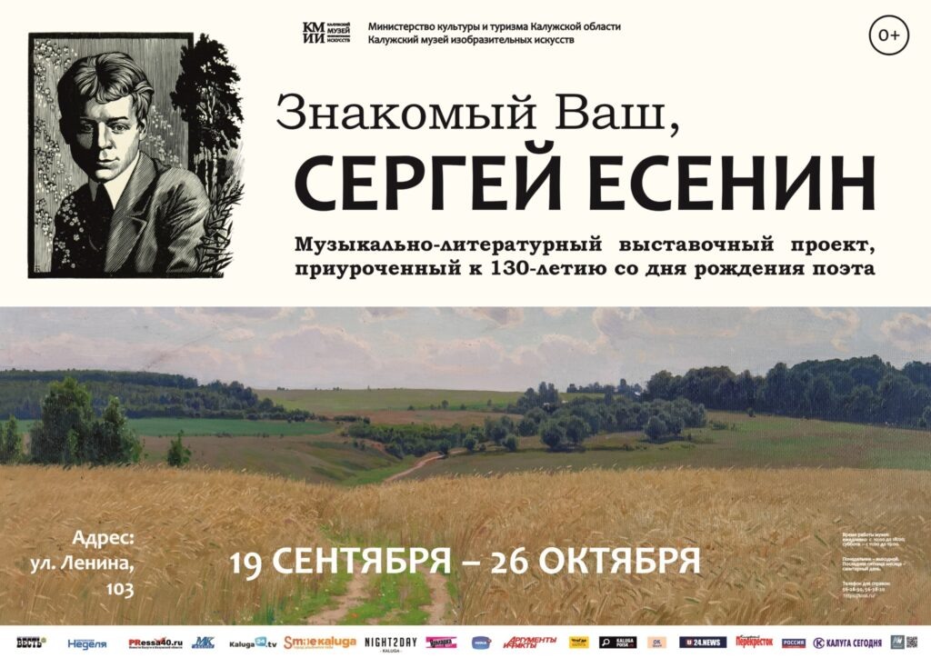 19 сентября 2025 года в Калужском музее изобразительных искусств состоится открытие музыкально-литературного выставочного проекта «Знакомый ваш, Сергей Есенин». Мероприятие приурочено к двум важным датам — 130-летию со дня рождения и 100-летию со дня смерти великого русского поэта. Имя Сергея Есенина занимает особое место в истории отечественной литературы. Его поэзия наполнена образами родной природы, философскими размышлениями о судьбе России, любовью и драматическими переживаниями. Есенин был не только лириком, но и своеобразным летописцем своего времени, чьи произведения продолжают вдохновлять поколения читателей и исследователей. Юбилейные даты стали поводом для создания проекта, объединяющего литературу, живопись и музыку. Проект «Знакомый ваш, Сергей Есенин» — это не просто экспозиция, а целое культурное событие, в котором объединяются разные виды искусства. Выставка фондовых работ переносит посетителей в атмосферу литературного мира поэта, а также в пространство его личной биог