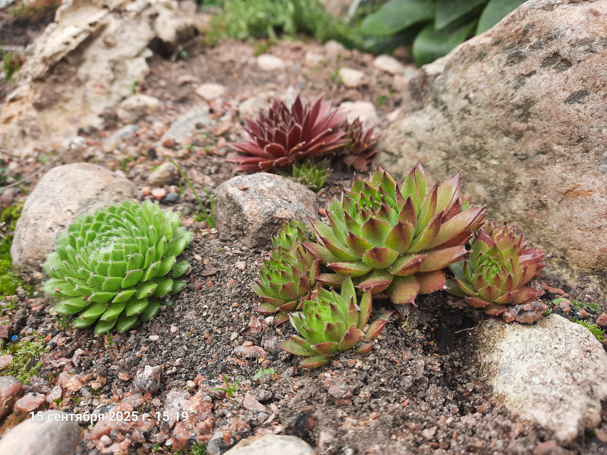 Сегодня с Таней как раз обсуждали молодила. Она их на края цветников пересадила, потому как после цветения выглядят не очень презентабельно. У нее богатая подборка растений, есть что посадить на видные места. У меня пока что поскромнее наборчик, так что я с интересом сажаю и рассматриваю разнообразные молодила. Им отведено много парадных мест, для них придуманы "подиумы" и "декорации". И даже несколько цветников, в которых они играют первую скрипку. Они там самые важные! В этом сезоне у меня появилось много новых экземпляров из разных источников. Я старалась подбирать группы при высадке в созданные для них цветники. И все же, подрастая, многие малыши меняли свой прикид. А где-то я сама сажала разных крошек, потому как было не очень понятно, какими они будут. Вот группа товарищей совсем разных. Бордовая розочка. Эта на шишечку похожа. У этой семейки "носы покраснели". Отчего, интересно? Здесь сизый оттенок у розетки. Еще "покрасневшая" история. Нынче многие просили цветных молодил