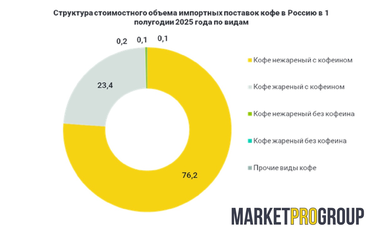 При этом из-за роста цен на кофейное сырье стоимостный объем импорта нежареного кофе в 2025 году растет активнее натурального. Согласно данным исследования «Анализ рынка кофе в России в 2025 году» компании MarketProGroup, доля нежареного кофе с кофеином в совокупной структуре импортных поставок на российских рынок кофе в стоимостном выражении за первое полугодие 2025 года возросла до 76,2%. В 2024 году нежареный кофе с кофеином также доминировал в структуре импорта кофе, однако его доля была ниже – порядка 72,4%. Стоит отметить, что доля этого вида кофе в натуральной структуре поставок продукции иностранных производителей выше, чем в стоимостном выражении, и превышает 80%. При этом в натуральном выражении в 2025 году доля нежареного кофе возросла менее значительно – с 84,2% до 85,3%. Такая ситуация стала следствием возрастания средней цены импорта нежареного кофе с кофеином в Россию в 2025 году, которое связано прежде всего с засухой в Бразилии и аномальными ливнями во Вьетнаме, которы