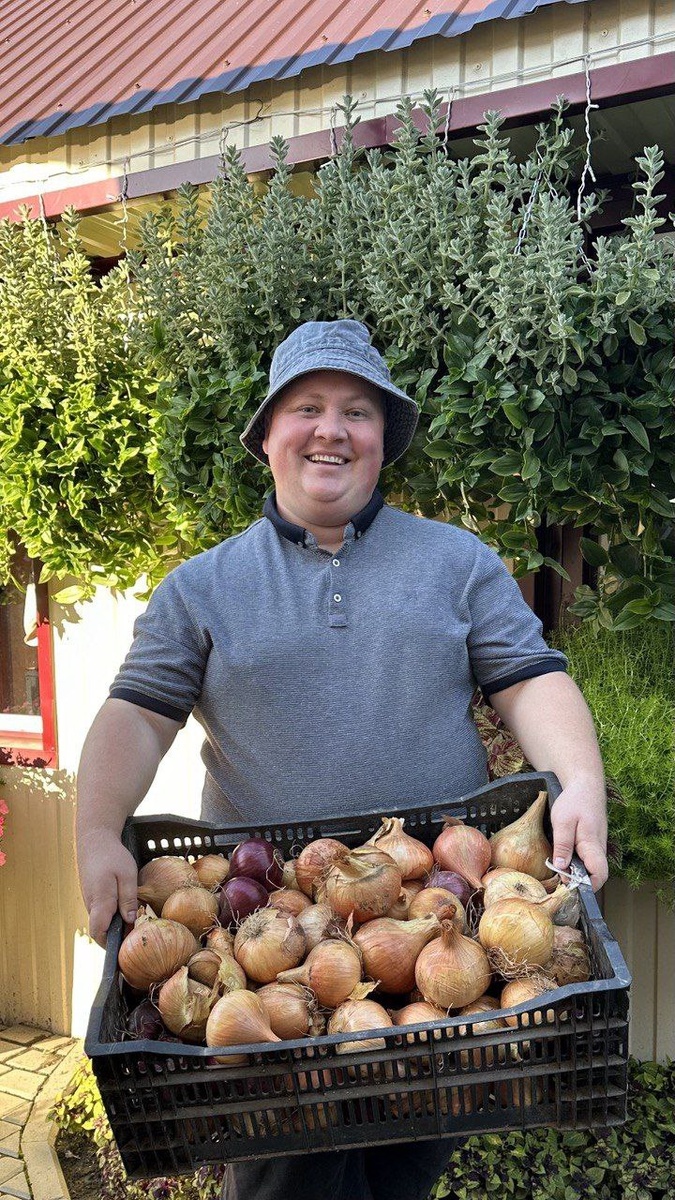 Я пока сделал фото с урожаем лука чуть не помер от тяжести🤪😅.Сегодня его перебрали и занесли в дом на хранение