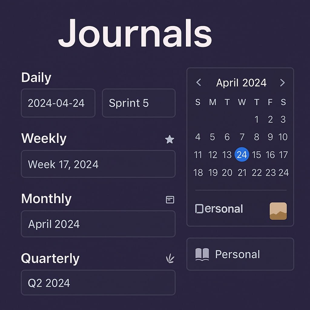 📆 Journals Незаслуженно обделенный вниманием плагин (всего 68К скачиваний). Если вы активно пользуетесь ежедневными заметками и чувствуете, что вот чего-то где-то как-будто не хватает - этот плагин вылечит вашу грусть 🙂 Смысл такой же, как и у привычной связки Calendar + Periodic Notes, но сделано это все в разы удобнее, функциональнее, и обновляется регулярно, в отличие от... Итак - Journals это плагин, который помогает вести регулярные повторяющиеся заметки. Поддерживаются разные виды журналов: ежедневные, недельные, месячные, квартальные, годовые и произвольные периоды (например, спринты). Ключевые возможности *⃣Журналы разных типов: daily / week / month / quarter / year / custom. *⃣Множественные журналы — можно завести разные журналы под работу, личную жизнь, проекты. И что очень круто - при клике на календарь, если у вас к примеру для ежедневных заметок заведено несколько журналов, плагин спросит - какой именно журнал использовать, и применит нужный шаблон и создаст заметку