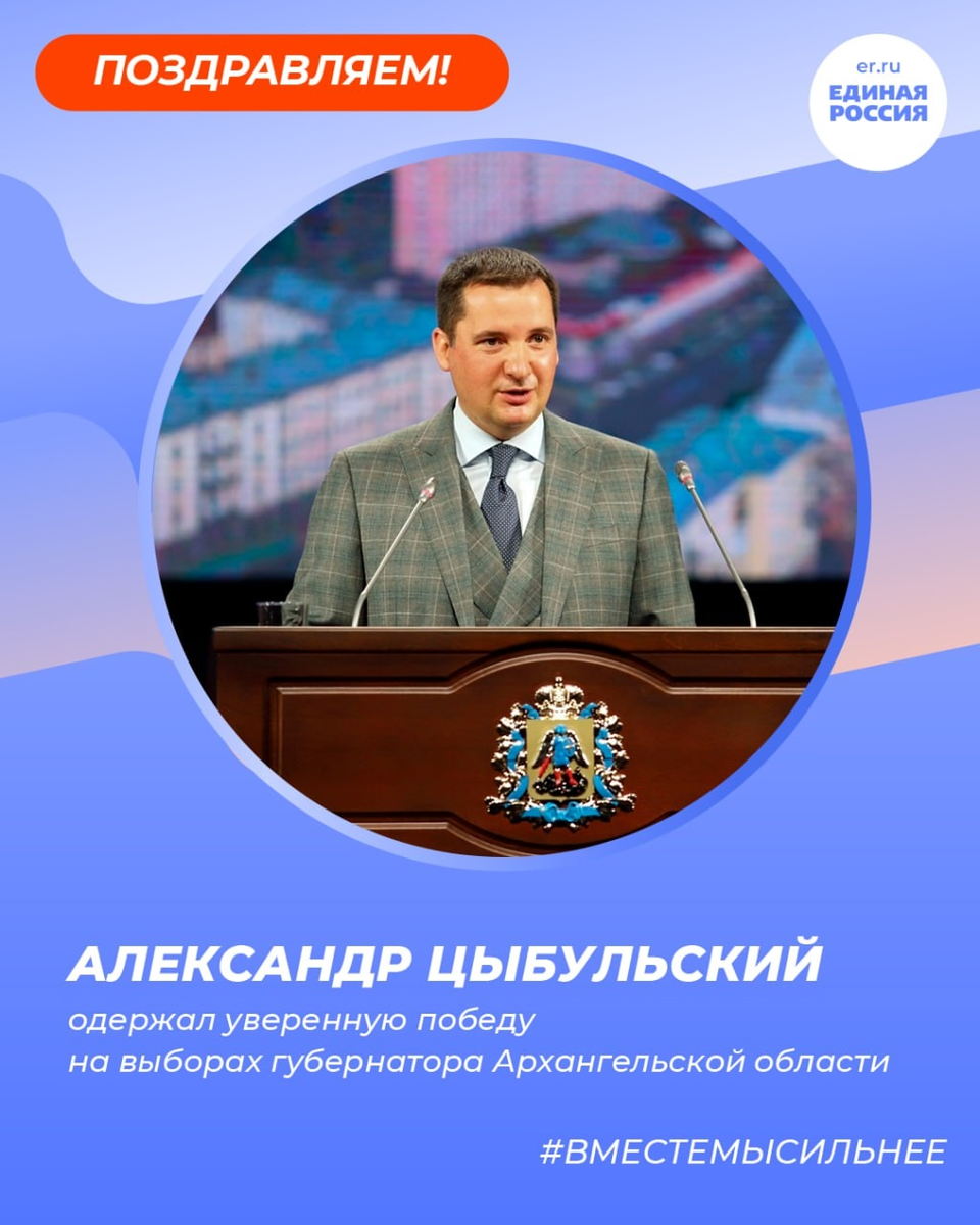 - Алексей Буглак («Российская партия пенсионеров за социальную справедливость») — 3,85% Александр Цыбульский возглавляет Архангельскую область с апреля 2020 года, когда был назначен временно исполняющим обязанности губернатора указом Президента Владимира Путина. Текущий результат подтверждает устойчивое доверие жителей региона к его руководству и политике. Таким образом, выборы продемонстрировали продолжение