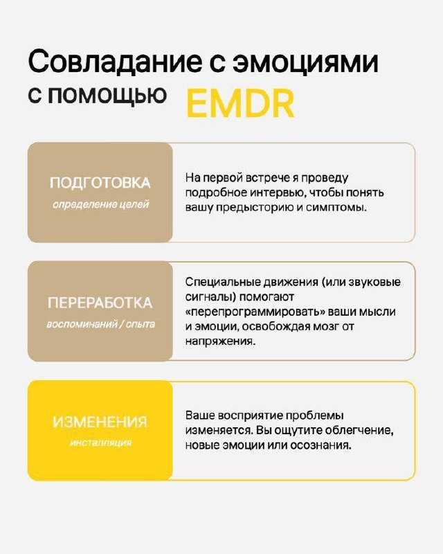 ДПДГ (EMDR) десенсибилизация и переработка движениями глаз - must-have в арсенале любого психолога и психотерапевта. И это вовсе не преувеличение! С чем чаще всего приходят клиенты? С различными запросами, в корне которых лежат застрявшие когда-то чувства и перманентные деструктивные состояния. Десенсибилизация и переработка движениями глаз (ДПДГ, англ. EMDR — Eye Movement Desensitization and Reprocessing) — это психотерапевтический метод, разработанный американским психологом Фрэнсин Шапиро в конце 1980-х годов. Основная цель метода заключается в снижении эмоциональной интенсивности травматических воспоминаний и ускоренной обработке негативных переживаний, помогая человеку справиться с последствиями различных травм, стресса, тревоги, фобий и посттравматического стрессового расстройства (ПТСР), которые являются причинами большинства запросов в терапии. Метод признан эффективным международным сообществом психологов и психиатров, включая Всемирную организацию здравоохранения (ВОЗ). Он