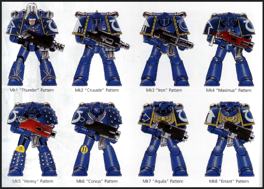 - Варианты: от древней и почитаемой брони «Гром» модели I до ультрасовременной брони модели X, которую используют Примарис-морпехи, — каждый комплект силовой брони является шедевром в области защиты и функциональности.