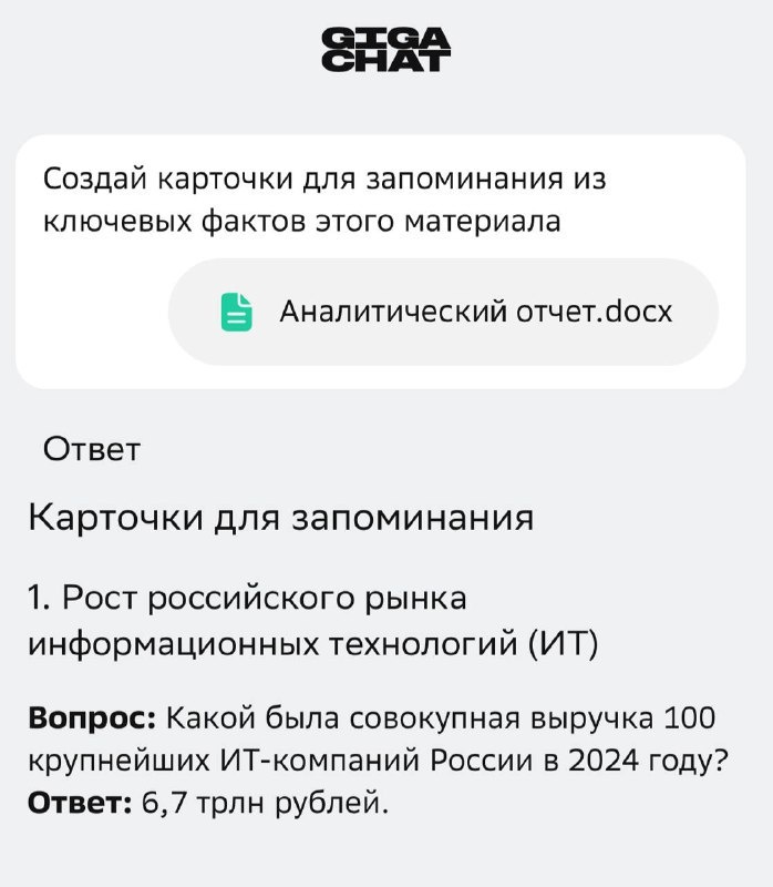 ✨ Хотите готовиться к презентациям и выступлениям быстрее и проще? Теперь это возможно благодаря "GigaChat"! Мы нашли "промт", который превращает ваш документ в компактные и информативные карточки 📋. Всё, что нужно — загрузить текст, и нейросеть сделает магию! "GigaChat" не только выделит ключевые факты, но и подготовит чёткий план повествования, чтобы вы могли уверенно донести свою мысль. 🧠 Карточки — отличный способ для запоминания и систематизации информации. А главное, это экономит ваше время. Попробуйте сами! Хочешь так же? Переходи в шапку профиля и далее по ссылке. 🚀 #искусственныйинтеллект #презентации #нейросети #подготовкаквыступлению #gigachat https://clck.ru/3NqYTQ