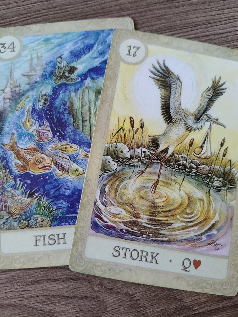 Эта комбинация карт благоприятна для творческих проектов, связанных с домом и семьей, а также для инвестиций в недвижимость. Помните, что перемены – это возможности, и правильное финансовое планирование поможет вам их реализовать. Аист несет весть о новом начале, а Рыба – о прибыльности ваших усилий.