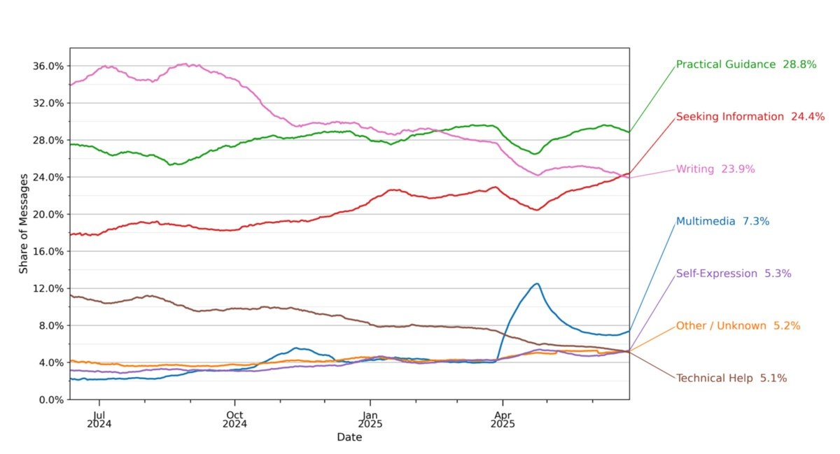73% запросов в ChatGPT не связаны с работой, а самая популярная категория — «практические советы», следует из отчёта OpenAI