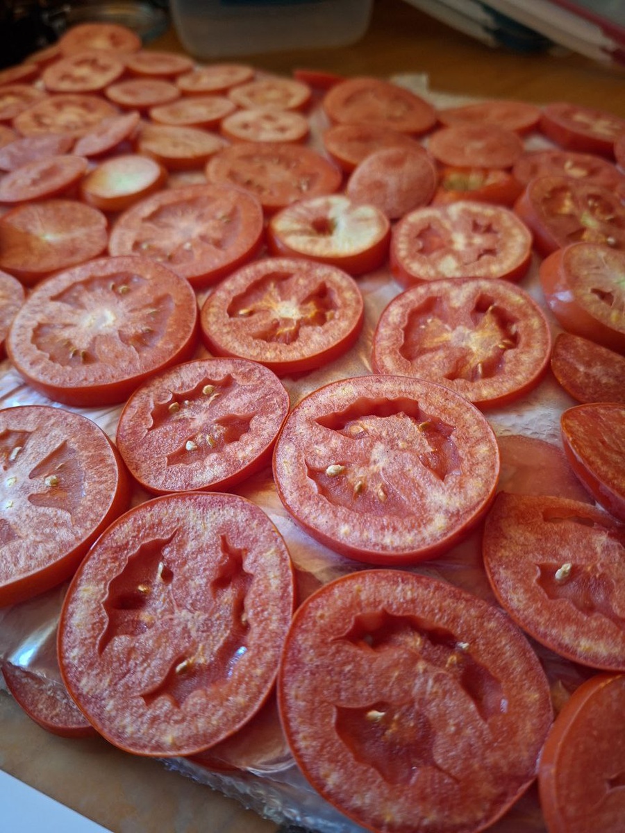 Дела последних дней: Заморозила помидоры. Пойдут на яичницы, горячие бутерброды и пиццу. Всем "знатокам" на вопрос "зачем это всё замораживать", отвечаю. Мы с мужем иногда хотим кушать, иногда нет. И никогда не подберешь нужное количество свежих овощей, чтобы не выкинуть их порчеными. А еще заморозка сохраняет многие витамины. Попробовала батат. Оказался слаще даже запеченной тыквы и моркови. Прям десерт😄 Насушила яблочных чипсов. Много чипсов. Сейчас сушится пастила яблочная. Решила, что чипсов много не бывает, и насушила ещё кокосовых, без добавок. Это мои десерты и перекусы. Хоть я и не сладкоежка, но витамины в такой форме мне нравятся) В завершение воскресенья накрутили с мужем фарш, и сделали домашних сосисок из индейки со свининой. Жира там было 0 целых хрен десятых совсем немного, но сосиски сочные за счет сливочного масла и сливок. Рецепт брала у одного фудблогера) За кадром ещё много килограмм переработки (перец, баклажаны и т.д.) Морозилка пополняется. Я тут сравни