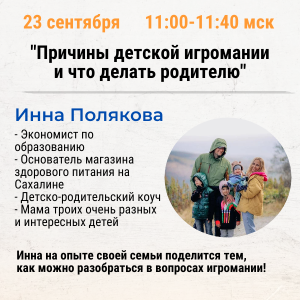 Кто из родителей сталкивался с детской игроманией? А кто из специалистов, помогающих практиков – работал или хотел бы работать с темой игромании в семье? Инна Полякова – мама троих очень разных и интересных детей, детско-родительский коуч, на опыте своей семьи поделится тем, как можно разобраться в вопросах игромании. 23 сентября в 11:00мск Инна расскажет свою собственную историю игромании у себя в семье и даст практические советы, как действовать родителям. Будет полезно и родителям, и коучам! Выступление Инны запланировано в рамках Первого международного фестиваля детско-родительского коучинга: https://coachforkids.org/coachkidsfest2025