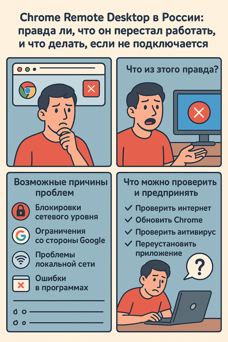 В последнее время в сети всё чаще появляются сообщения, что сервис Удалённого рабочего стола Chrome (Chrome Remote Desktop, CRD) якобы перестал работать в России. Некоторые пользователи утверждают, что не могут подключиться к удалённому компьютеру, что сайт remotedesktop.google.com не открывается, а приложение выдает ошибки. Что из этого правда? Давайте разберёмся. Почему может казаться, что Chrome Remote Desktop «не работает»: Если у вас не работает Chrome Remote Desktop, вот список шагов, которые стоит попробовать: 1. Подключение к Интернету: убедитесь, что сеть стабильна, нет сильной потери пакетов, высокая задержка. 2. Отключить VPN / прокси / пересмотреть настройки сети — иногда они мешают. 3. Проверить, открываются ли ключевые домены сервиса remotedesktop.google.com и remotedesktop-pa.googleapis.com. 4. Обновить Chrome и связанное приложение Chrome Remote Desktop до последних версий. 5. Проверить, не блокирует ли антивирус или фаервол службы, порты, процессы, связанные с CRD. 6.