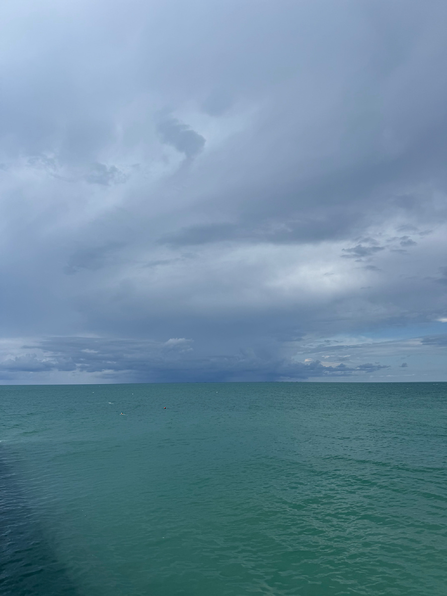 Далее — мой личный, строго соблюдаемый транспортный ритуал. Между приземлением самолета и отправлением поезда «Ласточка» должен быть обязательный минимальный временной резерв в 2 часа. Как хотите, может каприз, но я так делаю всегда. Цель — не стрессовать, а совершить церемониальный выход на берег Чёрного моря у сочинского (Адлерского) вокзала. Не важно, весна, зима, лето. В этот раз природа-соисполнитель подготовила спецэффект высочайшей категории сложности: восход солнца, пробивающийся сквозь грозовые тучи. Это был не умиротворяющий открыточный пейзаж, а драматическое театральное действо. Прямо 50 оттенков синего.