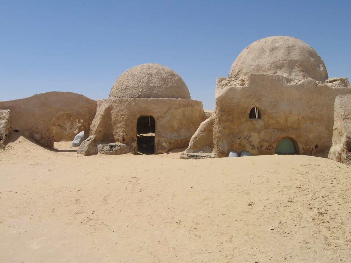 Те, кто знаком или смотрел легендарную киносагу Джорджа Лукаса «Звёздные войны», слышал такое словосочетание как «планета Татуин». Это вымышленная пустынная планета, фигурирующая в киноленте. В Тунисе существует реальный город Татавин, послуживший прототипом для названия целой фантастической планеты. Местность вокруг городка была идеальным местом для съёмок. Среди песчаных барханов, без растительности, началась постройка декораций для фильма. В разных частях пустыни их было построено несколько, но за более чем 40 лет с момента съёмок большинство из них было разрушено. Но одна сохранилась до наших дней практически в первоначальном облике. Это декорация космопорта Мос-Эспа, расположенного у края высокого бархана, который, кстати, медленно движется и через несколько лет полностью поглотит известную достопримечательность.