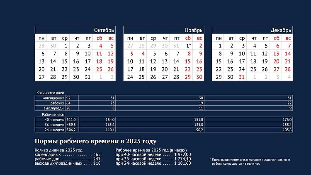Воронежцев ждет шестидневная рабочая неделя с 27 октября по 1 ноября. Производственный календарь опубликовали на сайте Государственной Думы РФ. Рабочий день в субботу при этом сделают сокращенным, поскольку он является предпраздничным перед Днем народного единства 4 ноября. Этот праздник учредил федеральный закон «О внесении изменений в статью 1 федерального закона «О днях воинской славы (победных днях) России» от 29 декабря 2004 года. Затем воронежцев ждут длинные выходные — со 2 по 4 ноября. Однако переноса выходных дней не будет в организациях с непрерывным циклом работы, экстренных службах и ежедневно обслуживающих население учреждениях. Для сотрудников праздничные дни могут оставаться рабочими по графику, однако работодатель обязан оплачивать их в повышенном размере. Ранее воронежцам назвали даты новогодних выходных в 2026 году. Возможность отдохнуть 12 дней выпадет с 31 декабря по 12 января. Так как 5 января в этом году совпало с нерабочими праздничными днями, его перенесли на 31